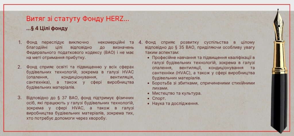 Фонд поєднує в собі економічний успіх і соціальну відповідальність, забезпечуючи сталість та єдність групи HERZ, яка вже понад сто років є символом надійності та якості у сфері енергоефективних технологій.