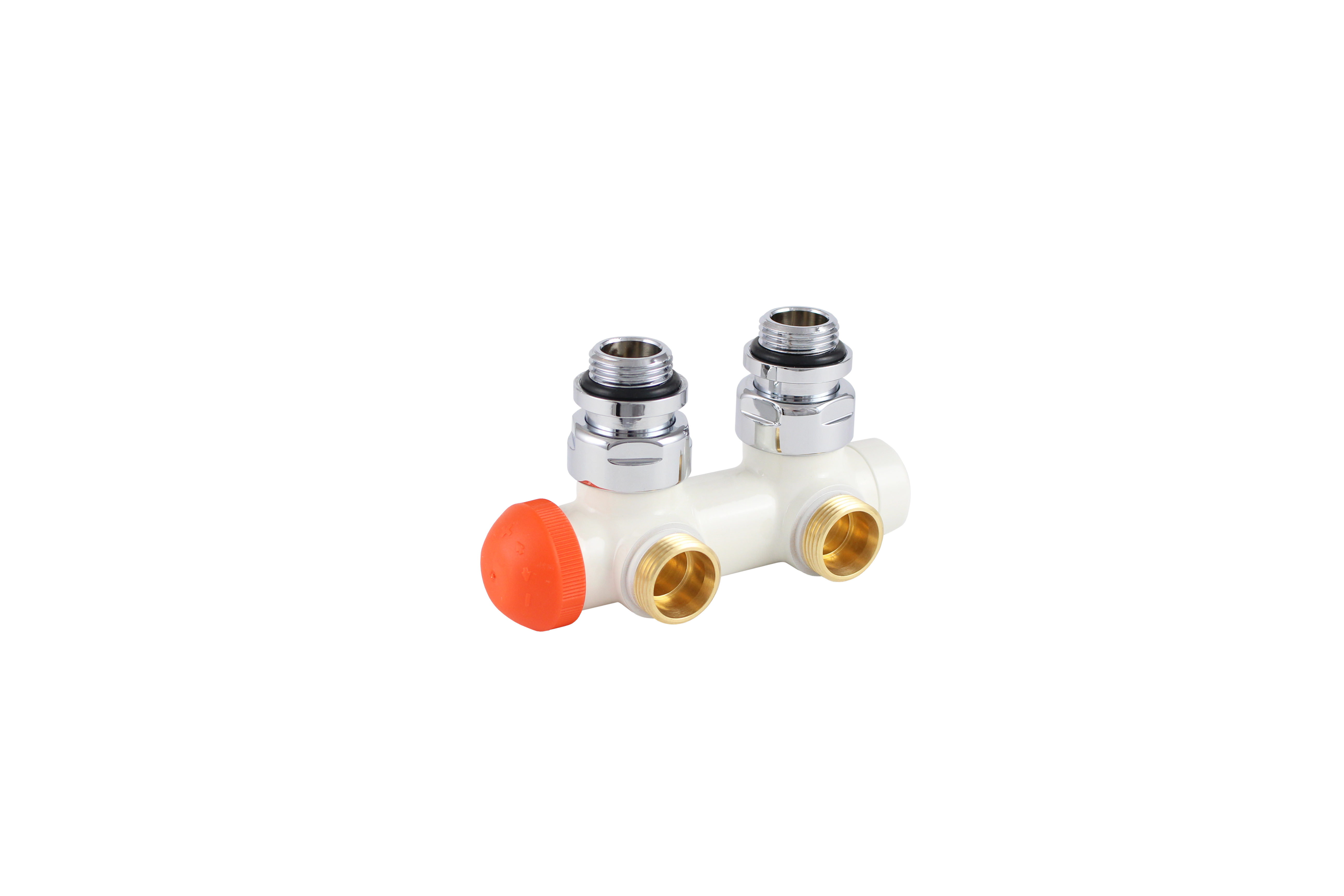 Для 2-трубних систем, міжосьова відстань – 50 мм. Різь підключення термостатичної головки – М28 х 1,5. На подавальному трубопроводі – вбудований запірний клапан. На зворотному трубопроводи – кран-букса TS-98-V з плавним попереднім налаштуванням, яку можна перекрити за допомогою латунного ковпачка (1632930). Підключення до радіатора – хвостовик G ½” з ущільнювальним кільцем. Підключення хвостовика до клапана – накидна гайка G ¾”. Підключення до системи – зовнішня різь М22 х 1,5 з ущільненням під конус.